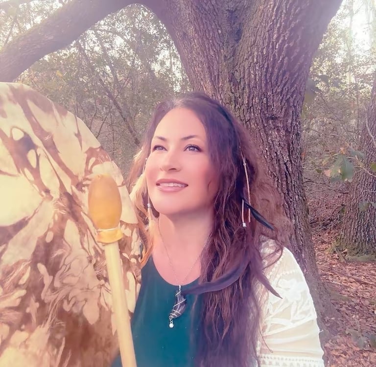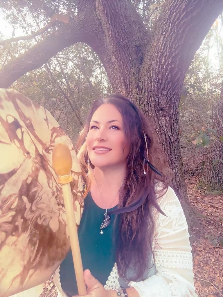 From the moment she could feel, Spirit walked beside her. A bridge between 2 worlds. At 14, an Elder in Arizona pressed her first medicine pouch into her hands and taught her songs that still echo in her bones. At 18, she died and returned—shattered and remade—in fierce love for our Mother Earth and a calling to live in balance with all living beings.